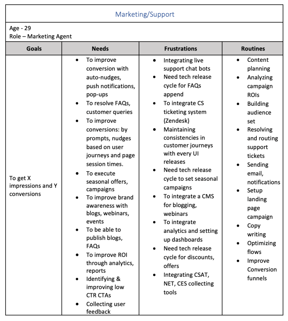 Note down the daily duties, routines and habits of the user to understand where your product or services helps improve the user’s workflow or fits in. Try to note them in a sequential manner. This may also include the responsibilities the user is expected to carry out to ensure the success of his goals (applicable for B2B).